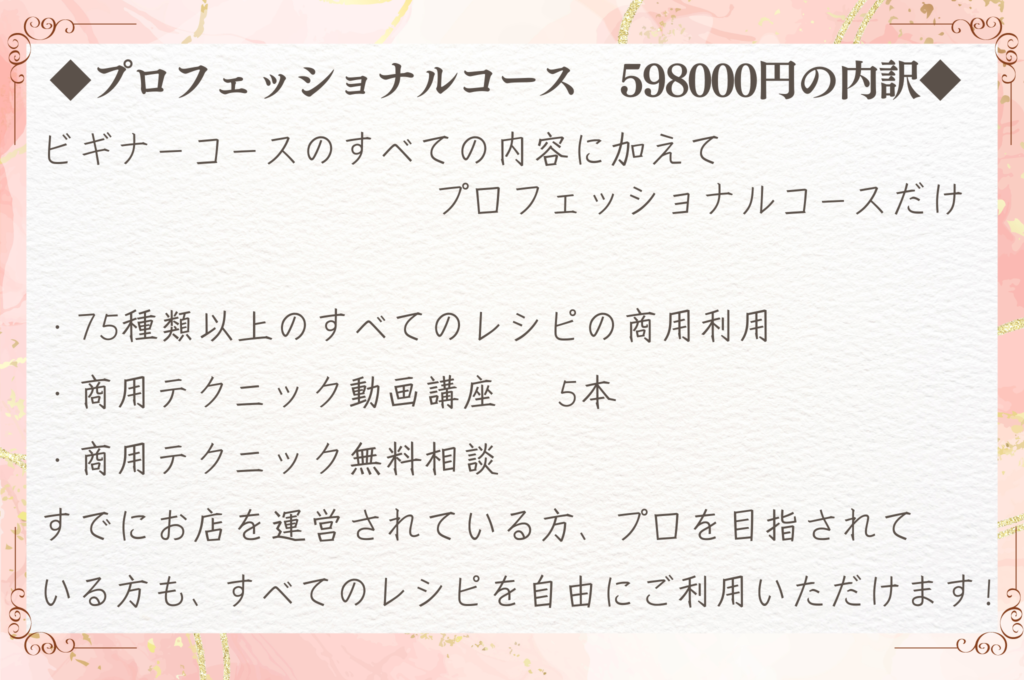 ※ レシピ商用利用権は、プロフェッショナルコースのみとなります。一般的にスイーツの開発は、レシピ案、試作、試食を繰り返すため、膨大な作業時間がかかることから、1品あたり約3万円〜5万円が相場と言われています。